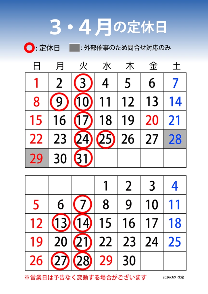 2026年 2・3月の定休日