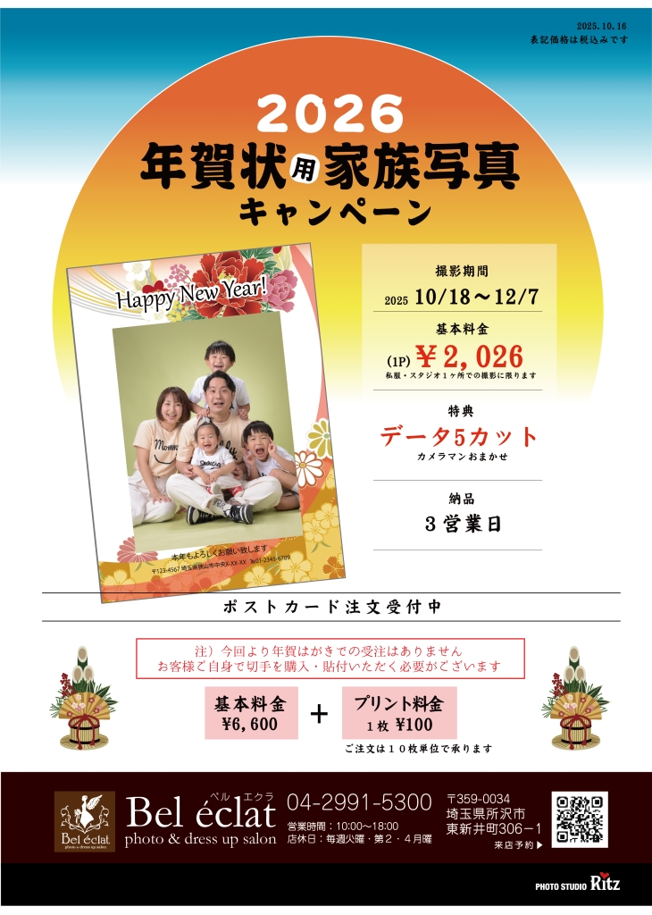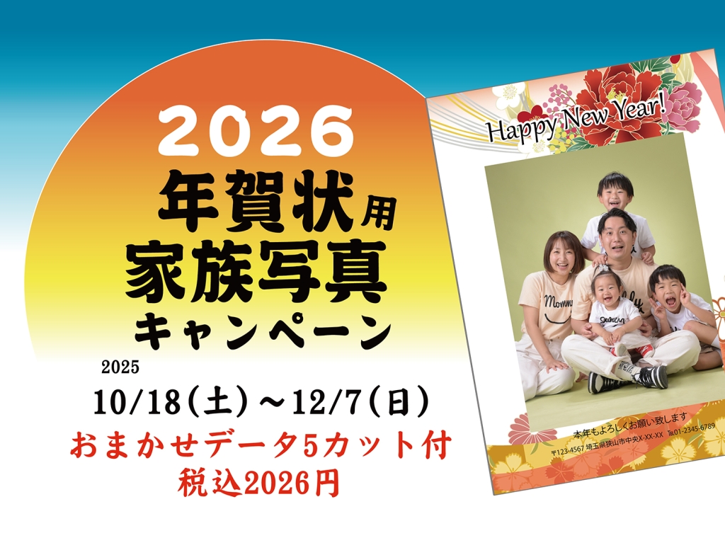 ツイート 2026年賀状[用]家族写真キャンペーン 2025年10月16日 14:15 お知らせキャンペーン新着 今年もやります! オトクな家族写真(`・ω・´) まだまだ10月、と言っているとあっというま! ご予約はおはやめにっ ご注意 【ポストカードご注文のお客様へ】 今回より年賀はがきでの受注はありません。 お客様ご自身で切手を購入・貼付いただく必要がございます。 ツイート この記事を書いたのはスタジオリッツ所沢店ベルエクラです。 ▼スタジオリッツ所沢店ベルエクラ ▼〒359-0034埼玉県所沢市東新井町306-1 ▼℡04-2991-5300 書いた記事一覧 Today 1Week Total 新着 キャンペーン イベント ブログ コラム お客様の声