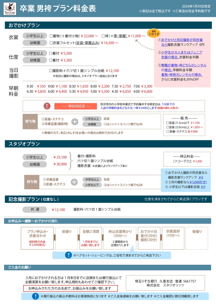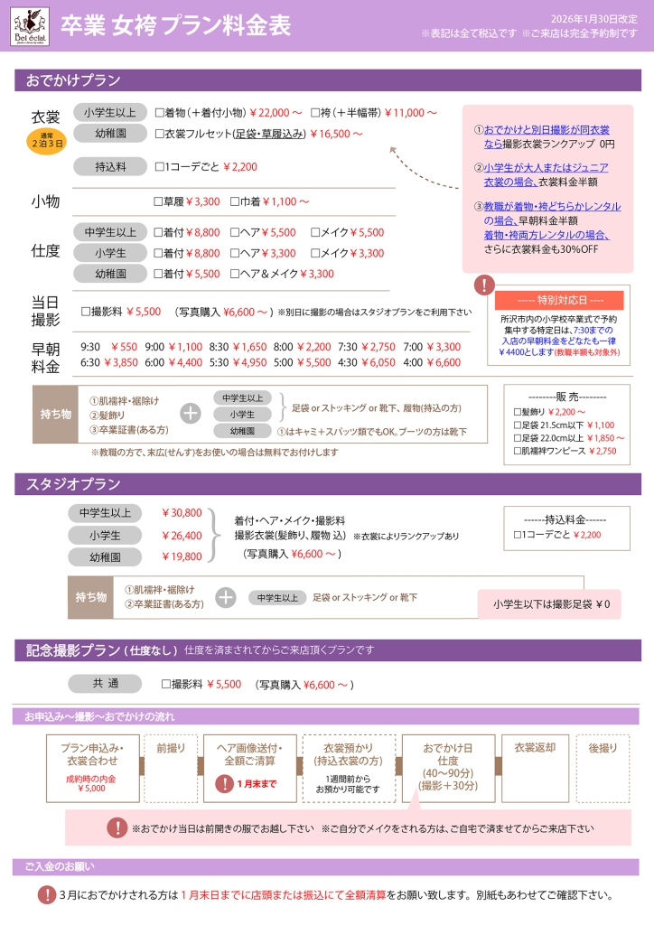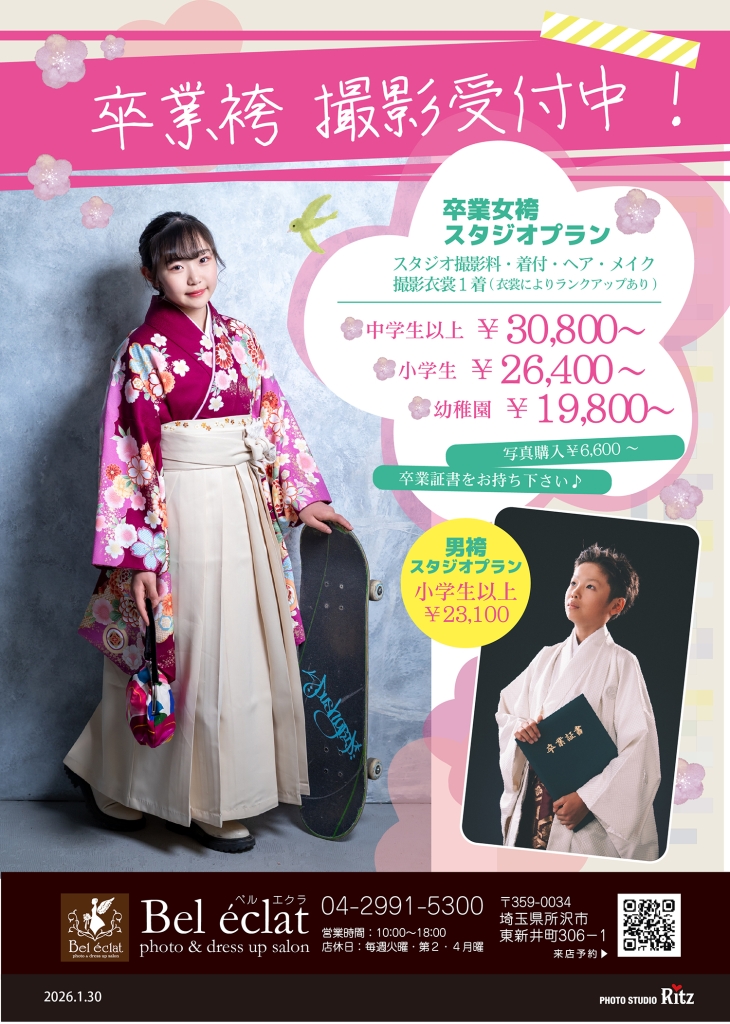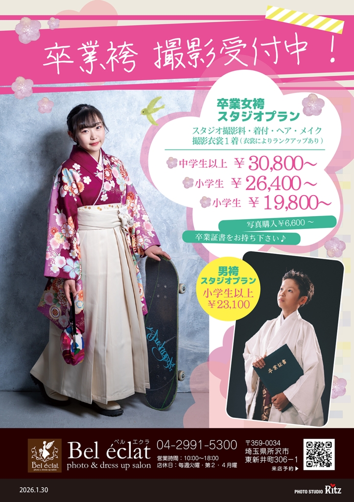 ツイート 2026年 卒業袴 各プラン予約受付中! 2026年01月30日 13:24 お知らせコラムブログ新着 ▼記念撮影ならスタジオプラン! ▼卒業式の衣裳レンタルや着付・ヘアならおでかけプラン! ▼お電話予約はコチラ ▼問合せフォームはコチラ ツイート この記事を書いたのはスタジオリッツ所沢店ベルエクラです。 ▼スタジオリッツ所沢店ベルエクラ ▼〒359-0034埼玉県所沢市東新井町306-1 ▼℡04-2991-5300 書いた記事一覧 Today 1Week Total 新着 キャンペーン イベント ブログ コラム お客様の声