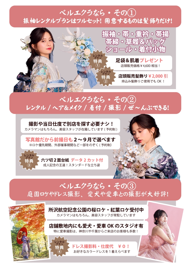 - 実施内容:レンタル振袖の展示・予約受付、式典当日の着付などの予約受付、前撮りの予約受付、当店の成人プランのご紹介、お問い合わせ受付、ほか